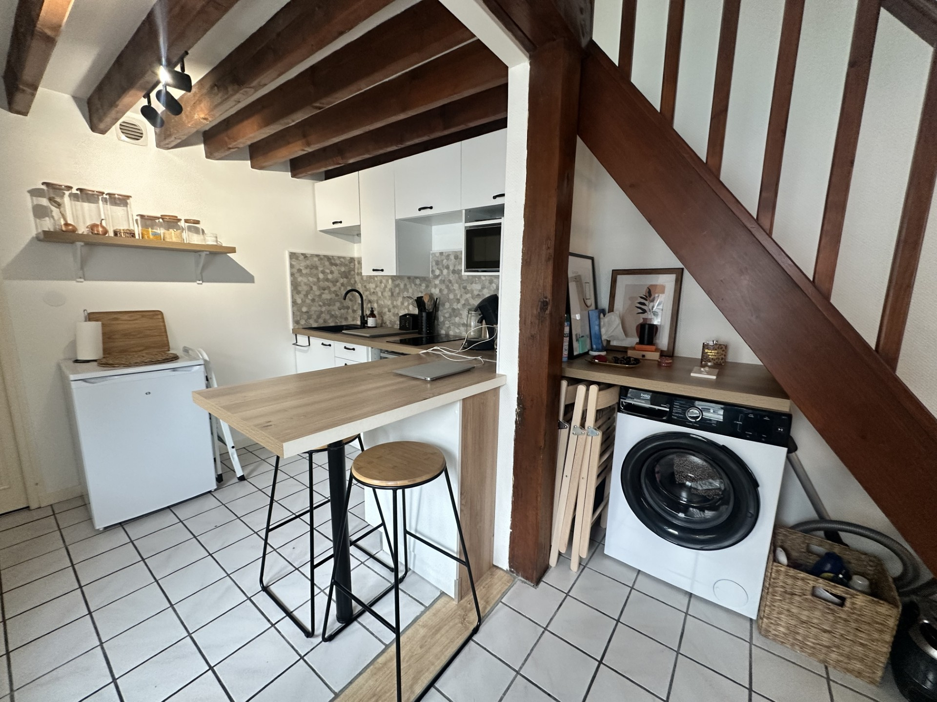 Comprenant: une entrée avec bureau, séjour avec canapé et table basse, cuisine équipée et aménagée avec espace repas, salle de bains ,emplacement pour machine à laver, à l'étage chambre avec commode et penderie.