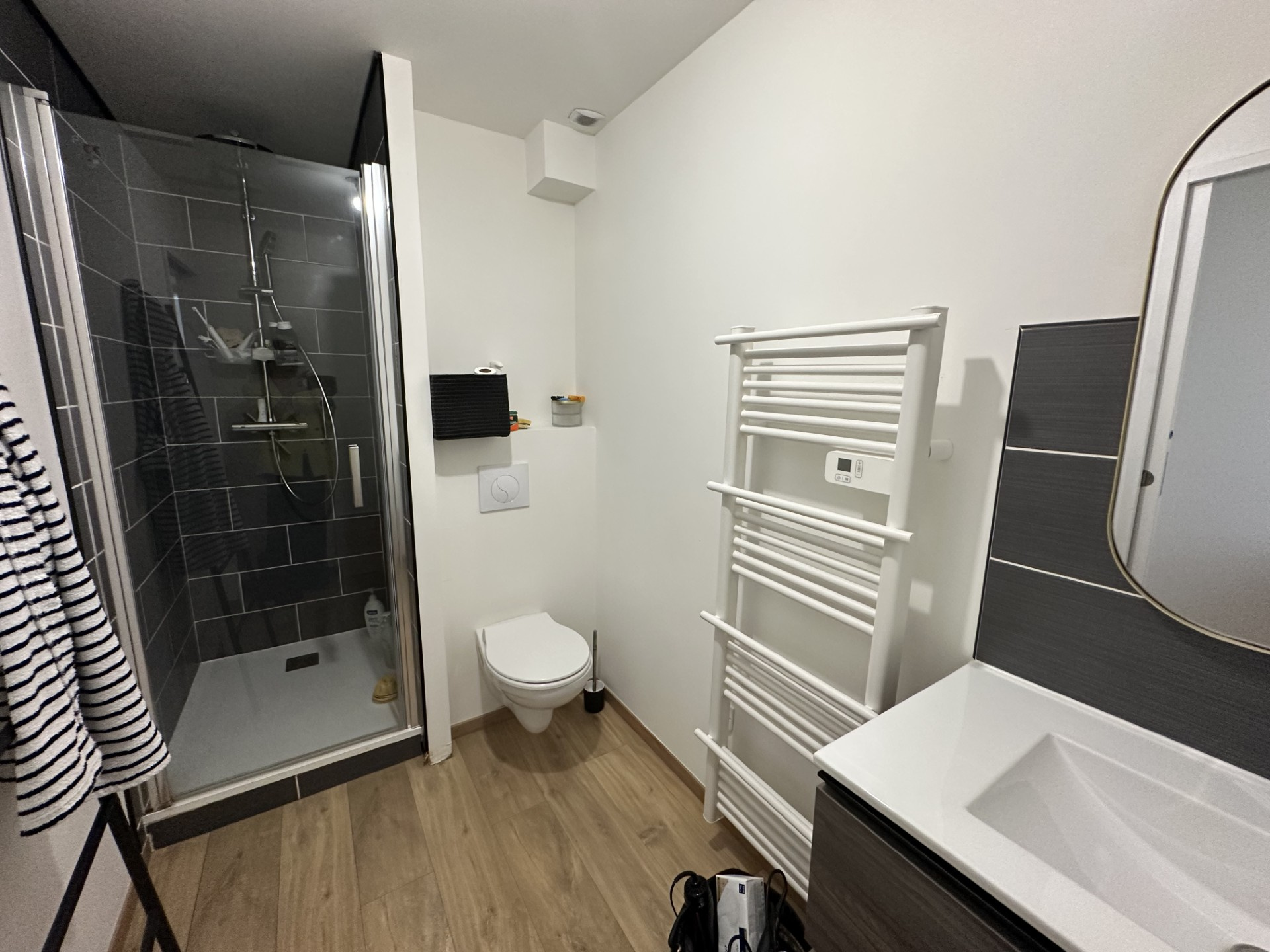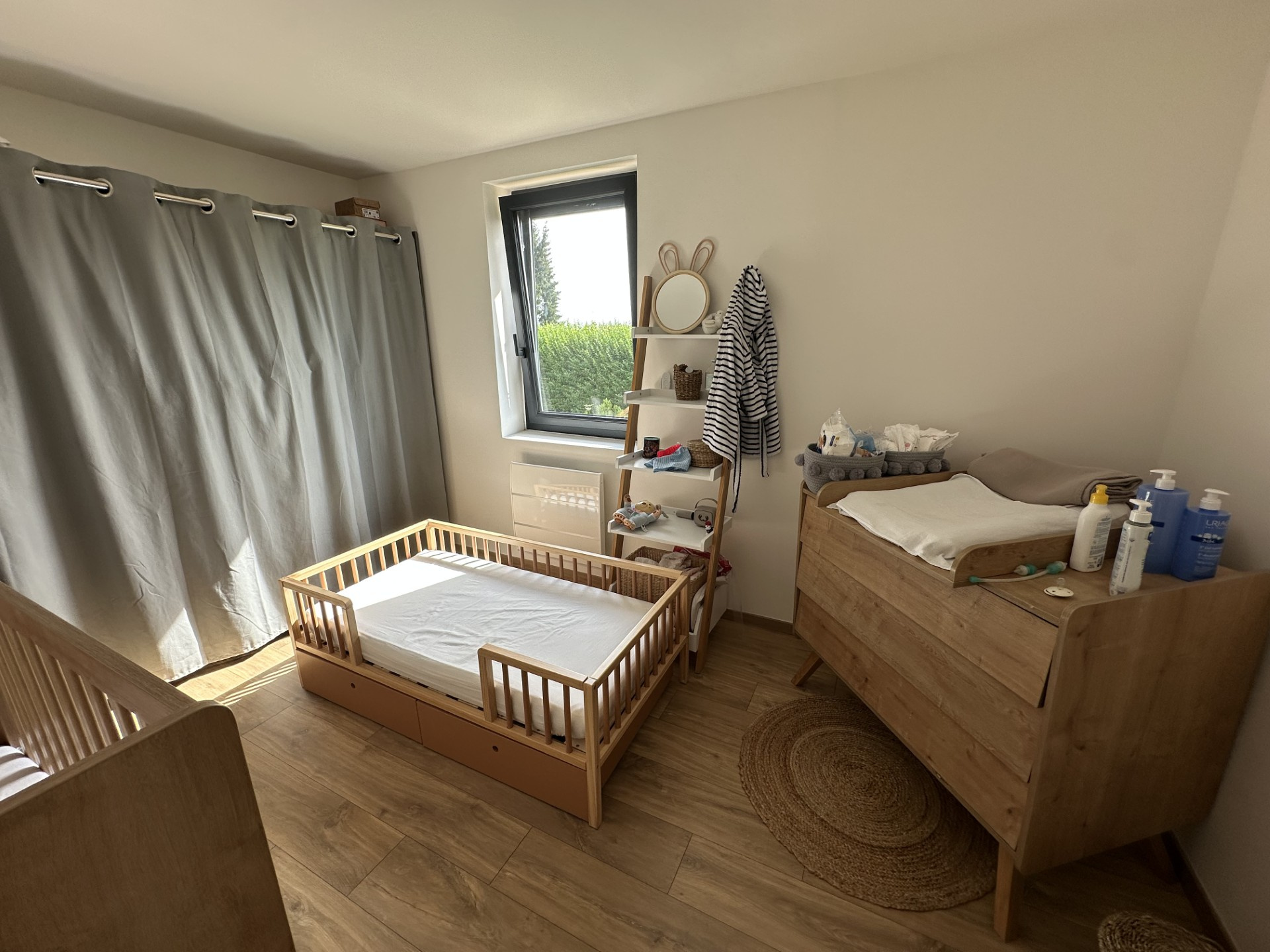 Elle comprend au rez-de-chaussée une vaste entrée distribuant une agréable pièce de vie, salon -salle à manger, cuisine équipée -aménagée, accès à la terrasse bien exposée et sans-vis à vis, une chambre ou bureau, toilettes indépendants.