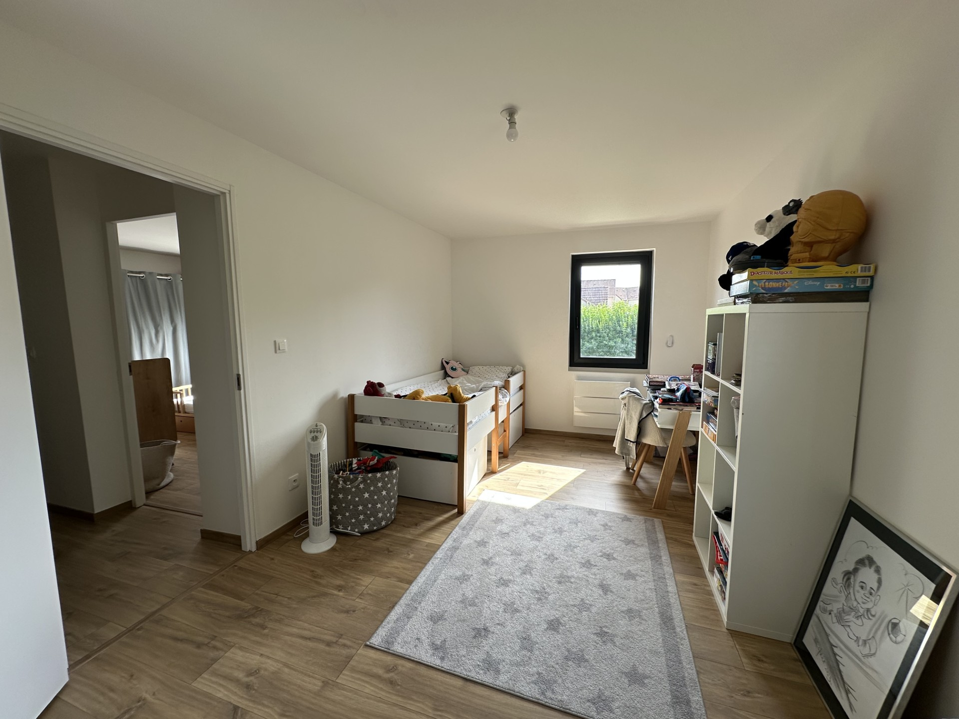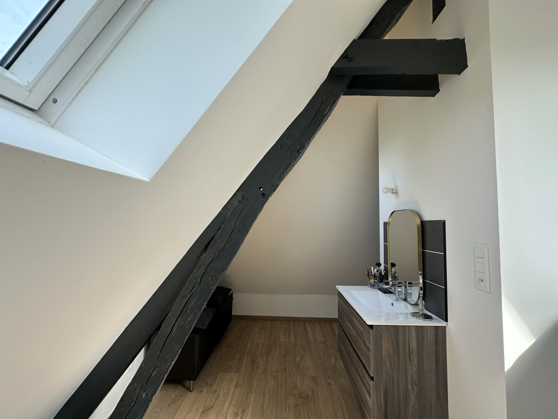 A l'étage: palier desservant 3 chambres (dont une suite parentale avec toit cathédrale) salle de bains et douche avec toilettes.