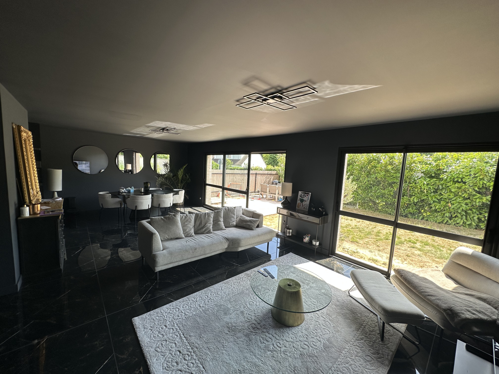 Pompe à chaleur, chauffage au sol haut et bas, huisseries aluminium, installation domotique en cours.